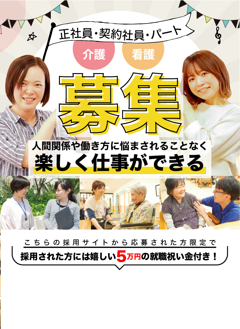 | 業務内容 | 職員と利用者両方の幸せを実現することがテーマの介護施設のチームの一員となってより良い施設の運営に参加します。 基本的な入浴・食事・排泄の介助だけじゃなく、どうすればご利用者や家族の方に喜んでもらえるか?などについて一緒にアイデアを出したりチャレンジできるのでマンネリの毎日とは無縁の職場です。 ここが違う!サンハイツなら楽しく働ける理由 |